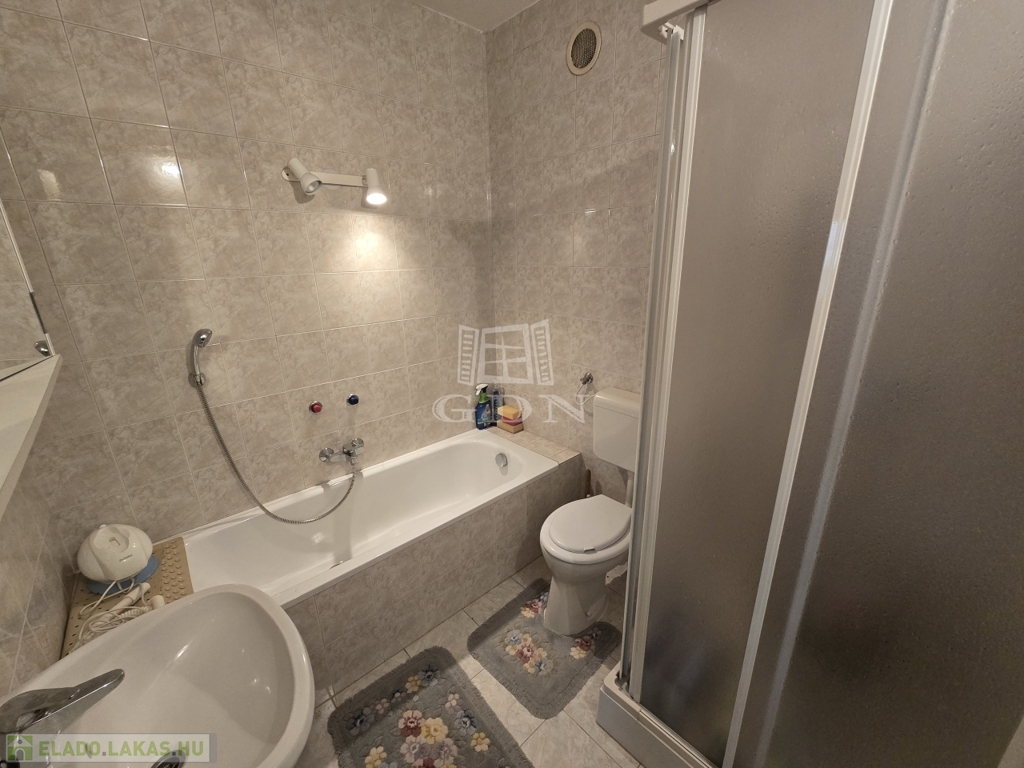 - Nagy méretű fürdőszoba káddal és zuhanyzóval, ahol a WC is helyet kapott.