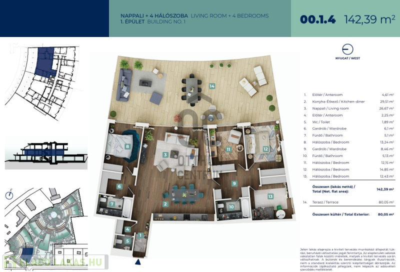Az ingatlanpiac legújabb gyöngyszeme várja Önt és családját! Ez a kiváló állapotú, új építésű lakás ideális választás mindenki számára, aki a modern életstílust és a prémium kivitelezést keresi. Az ingatlan alapterülete 142m2, amely négy tágas szobát kínál hatalmas nappalival, továbbá két tágas gardróbbal, így bőven elegendő helyet biztosít a családi élethez. Természetesen két fürdőszoba toalettel, illetve egy különálló toalett is megtalálható az ingatlanban. A 80m2-es terasz tökéletes helyszín a pihenésre és a szabadban eltöltött időre. A lakás minimalista kialakítása és világos, barátságos terei azonnal magukkal ragadják az érdeklődőket. Az ingatlan okos otthon rendszerrel van felszerelve, amely lehetővé teszi a modern technológiák egyszerű és kényelmes használatát. Az elektromos (fan-coil) fűtés-hűtés gondoskodik a maximális komfortérzetről, míg az automata öntözőrendszer a kert szépségét megőrzi. A lakópark, amelyben az ingatlan található, exkluzív környezetet biztosít, és a csendes, rendezett kertje a nyugalom szigetét nyújtja a város forgatagában. A medence lehetőséget ad a családok számára a közös időtöltésre, míg a portaszolgálat biztonságot és kényelmet nyújt. Az ingatlan közlekedési csomópont közelében helyezkedik el, így a város tömegközlekedési lehetőségei könnyen elérhetők. A környék ellátottsága kiváló, hiszen a közelben találhatóak bolt, iskola, óvoda és orvosi rendelő, így minden szükséges szolgáltatás könnyedén elérhető. A biztonságos és csendes környezet ideális helyszínt biztosít a családok számára, akik a nyugodt életet keresik. Egy ilyen egyedi tervezésű ingatlan nem mindennapi lehetőség, ezért érdemes mielőbb megtekinteni! Kérjük, ne habozzon felkeresni bennünket, amennyiben bármilyen kérdése van a lakással, lakóparkkal, vagy a környékkel kapcsolatban.