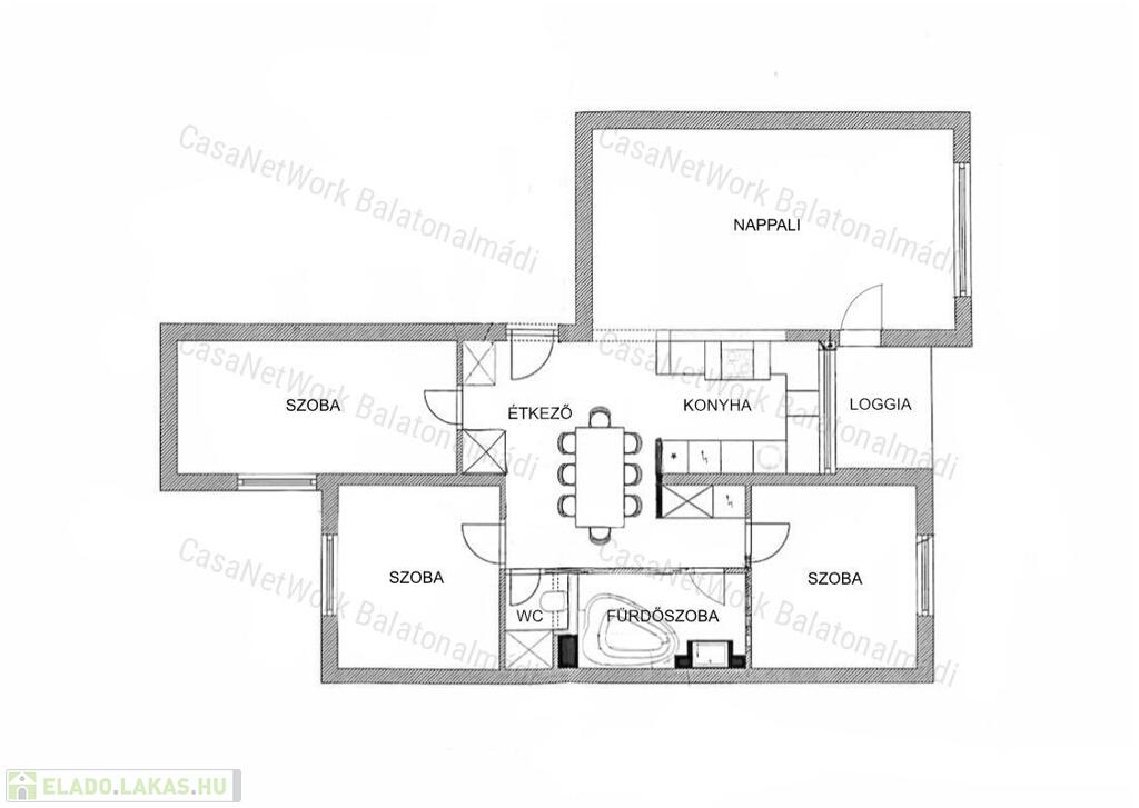 - Ideális kialakítású terek: napfényes nappali, összeköttetésben a konyha-étkezővel, három hálószoba, fürdőszoba, toalett és loggia