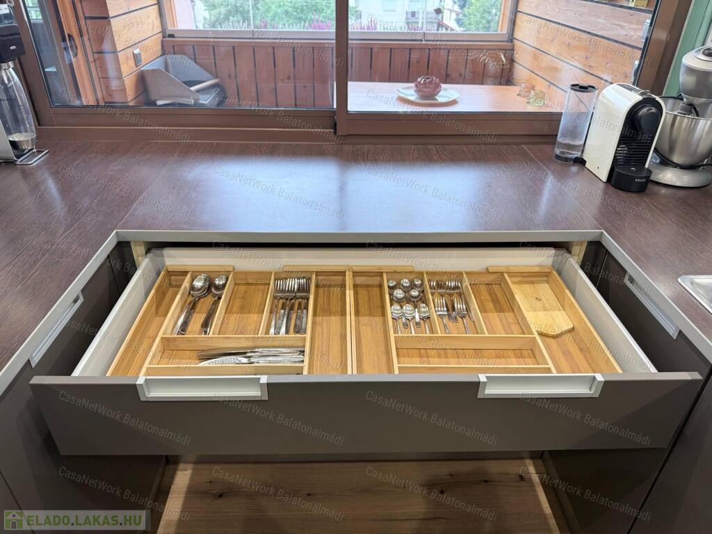 zöldségmosó, üvegburkolat az alsó és felső szekrények között, tolóablak a loggia irányába.