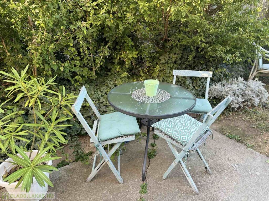 A telekre (illetve a telek előtt is) akár több gépkocsinak is lehetősége van beállni, jelenleg kint megoldott a parkolás. A kert nagyon hangulatos, intim. A kiadott lakrész előtt 20 nm terasz, 2 nm tároló, illetve a fodrászat előtt is szépen parkosított az udvar.