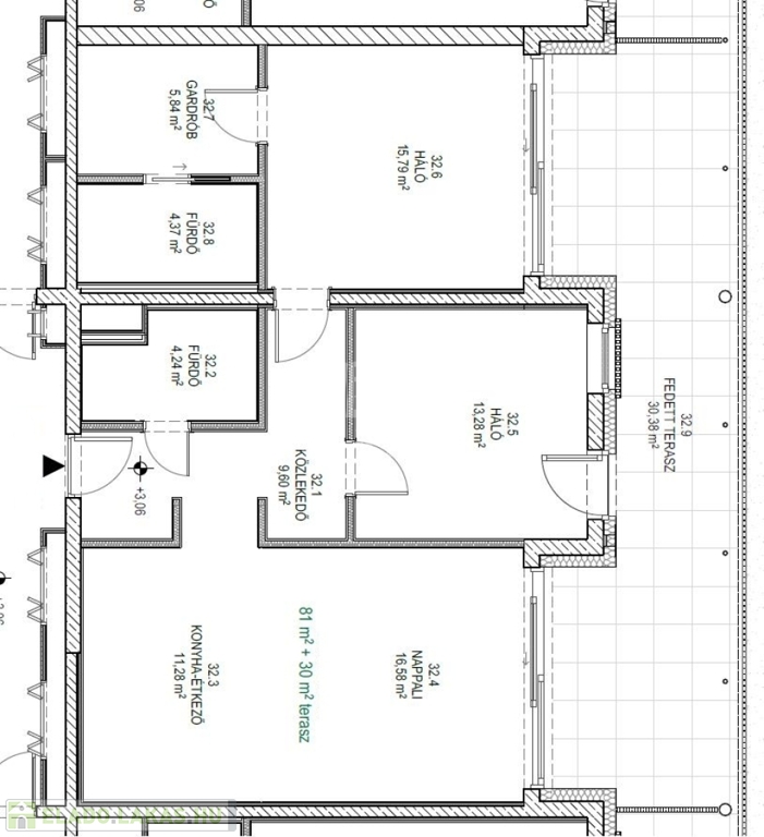 Ez a lakás nappali+2 hálós+ gardrób szobás, 81nm alapterületű+ tartozik hozzá 30nm fedett terasz is.
