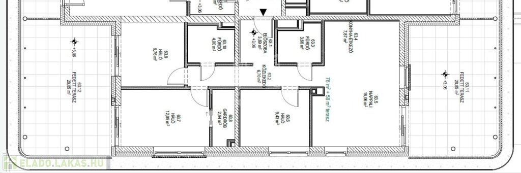 Ez a lakás nappali+3 hálós, 76nm alapterületű+ tartozik hozzá két (29nm+29nm) összesen 58nm fedett terasz is.