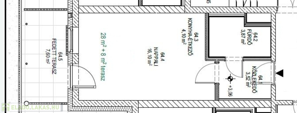 Ez a garzonlakás 28nm alapterületű+ tartozik hozzá egy 8nm-es fedett terasz is.