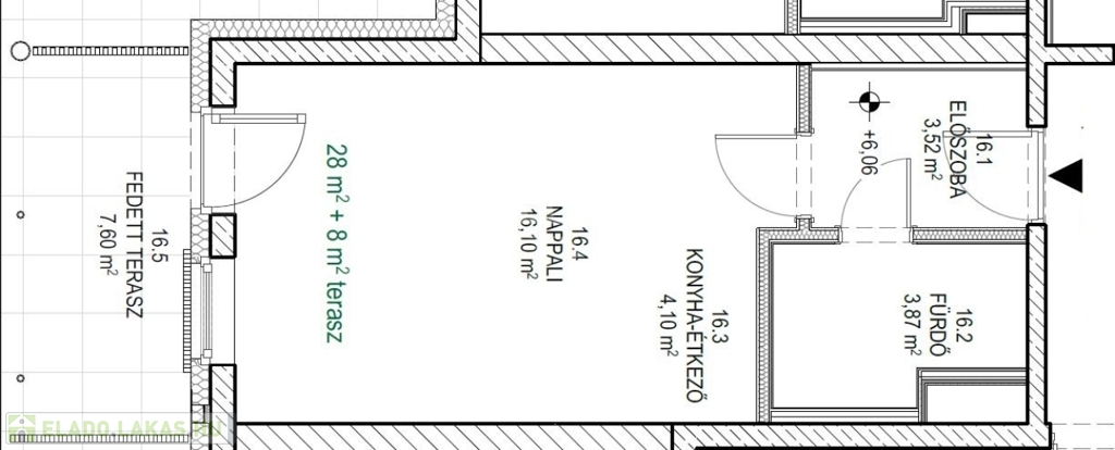 Ez a garzonlakás 28nm alapterületű+ tartozik hozzá egy 8nm-es fedett terasz is.