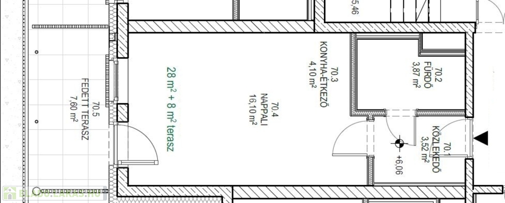 Ez a garzonlakás 28nm alapterületű+ tartozik hozzá egy 8nm-es fedett terasz is.