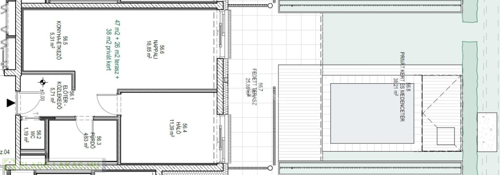 Ez a lakás nappali+1 hálós, 47nm alapterületű+ tartozik hozzá egy 26nm-es fedett terasz és 38nm privát kert is.