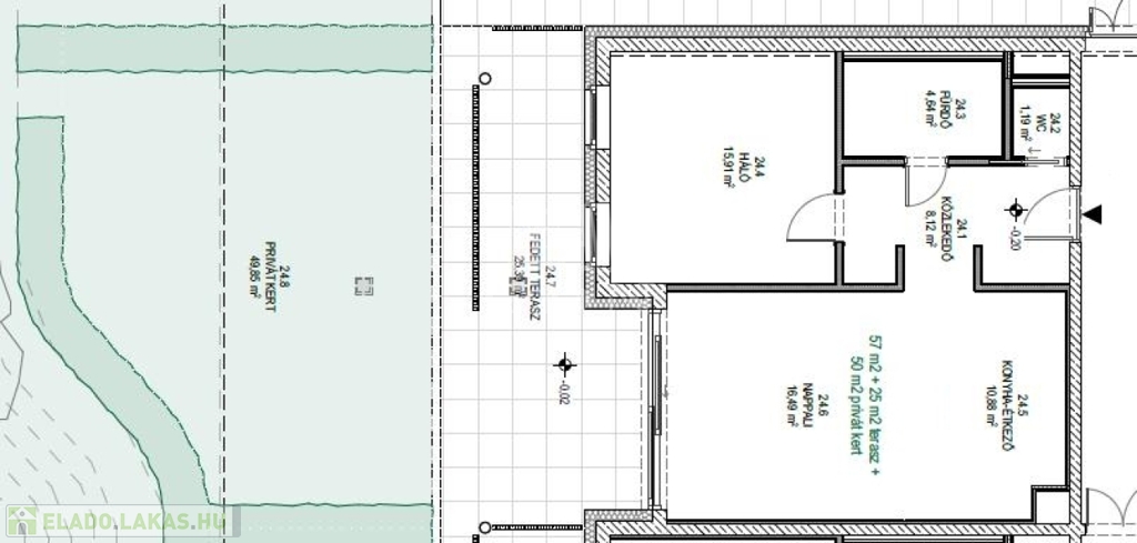 Ez a lakás nappali+1 hálós, 57nm alapterületű+ tartozik hozzá egy 25nm-es fedett terasz és 50nm privát kert is.