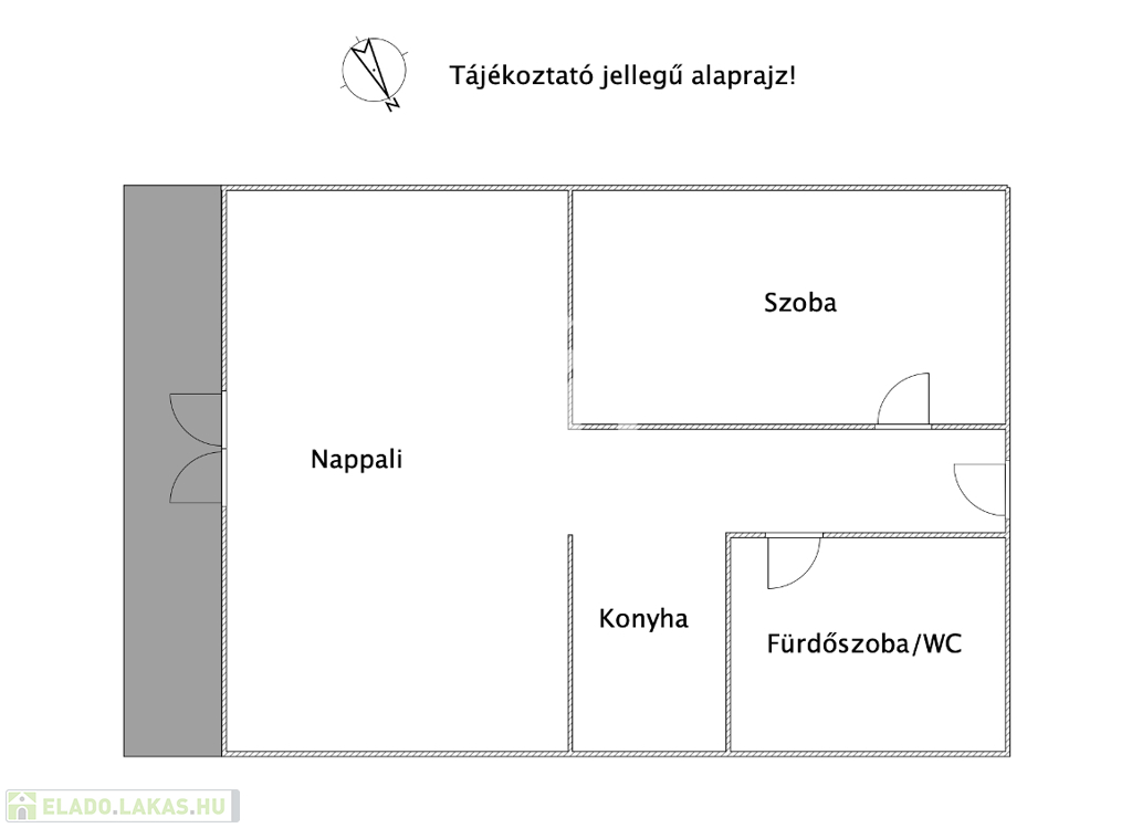 - 1 egész szobából, 1 félszobából, 1 előszobából, 1 konyhából, 1 fürdőszobából/ Wc-ből áll.