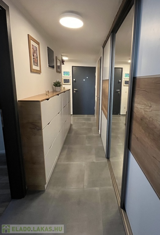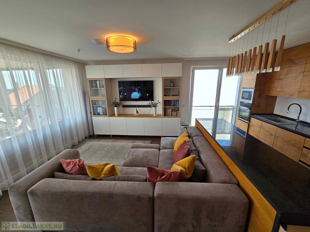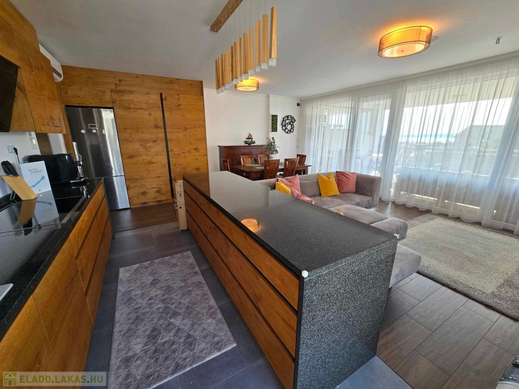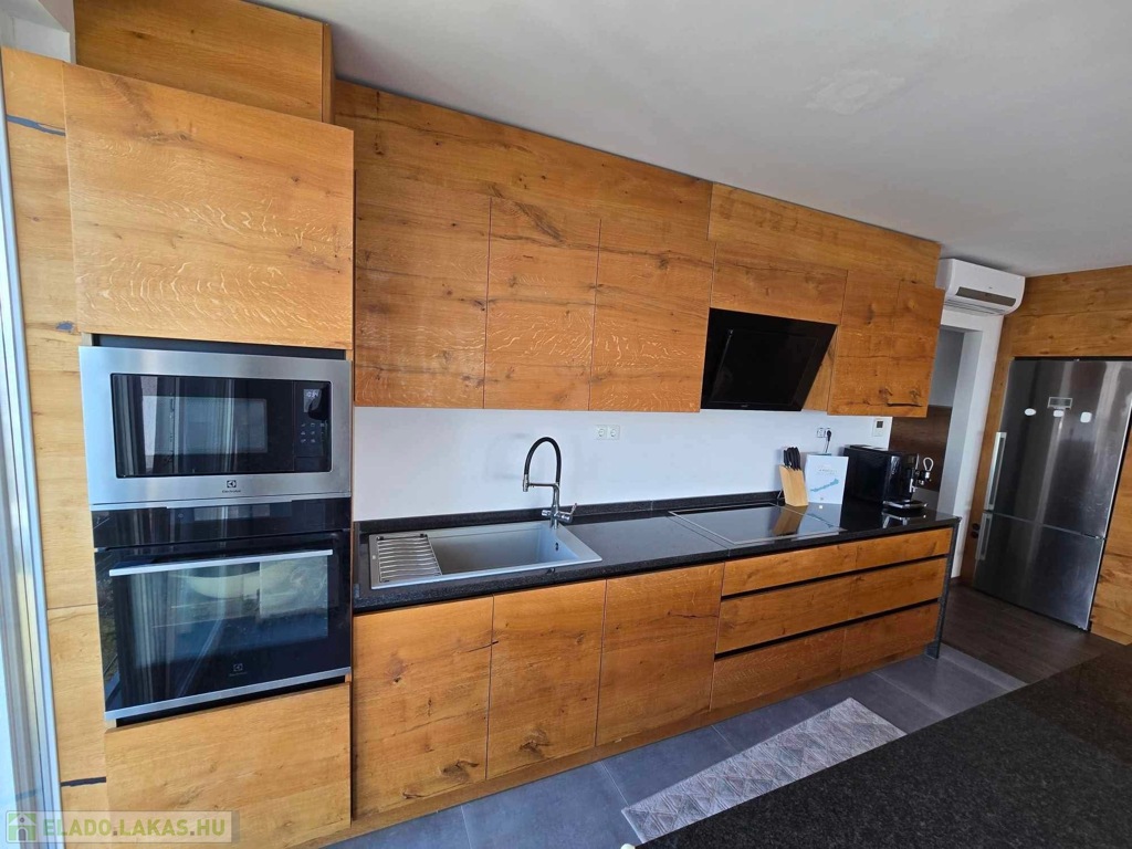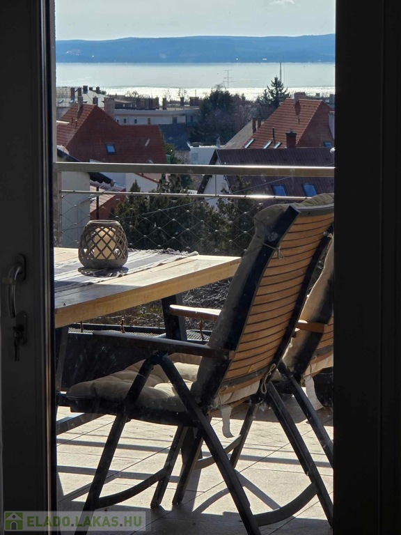 A 83 m²-es ingatlan praktikus elosztású: tágas, közel 40 m²-es nappali–konyha–étkező, 2 külön nyíló hálószoba, fürdőszoba, valamint külön vendég WC biztosítja a kényelmes mindennapokat. A nappaliból nyíló, 26 m²-es fedett teraszról gyönyörű panoráma nyílik a Balatonra és a Tihanyi-félsziget irányába.