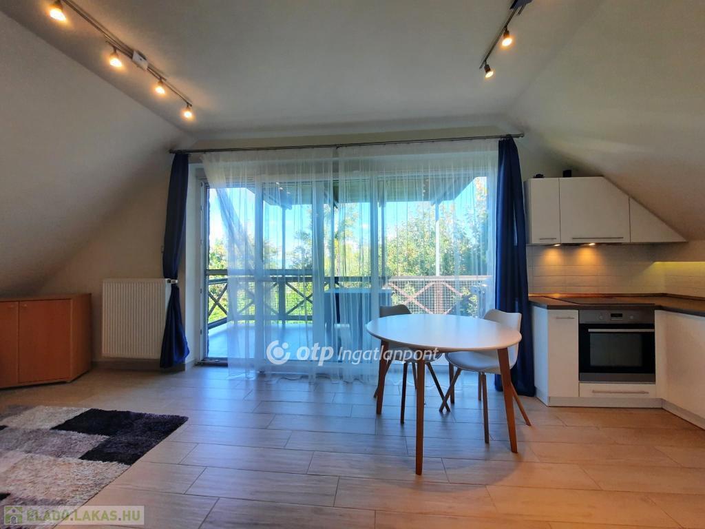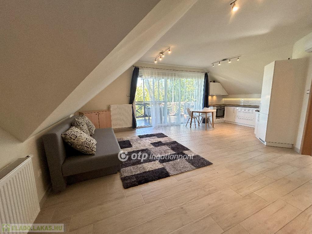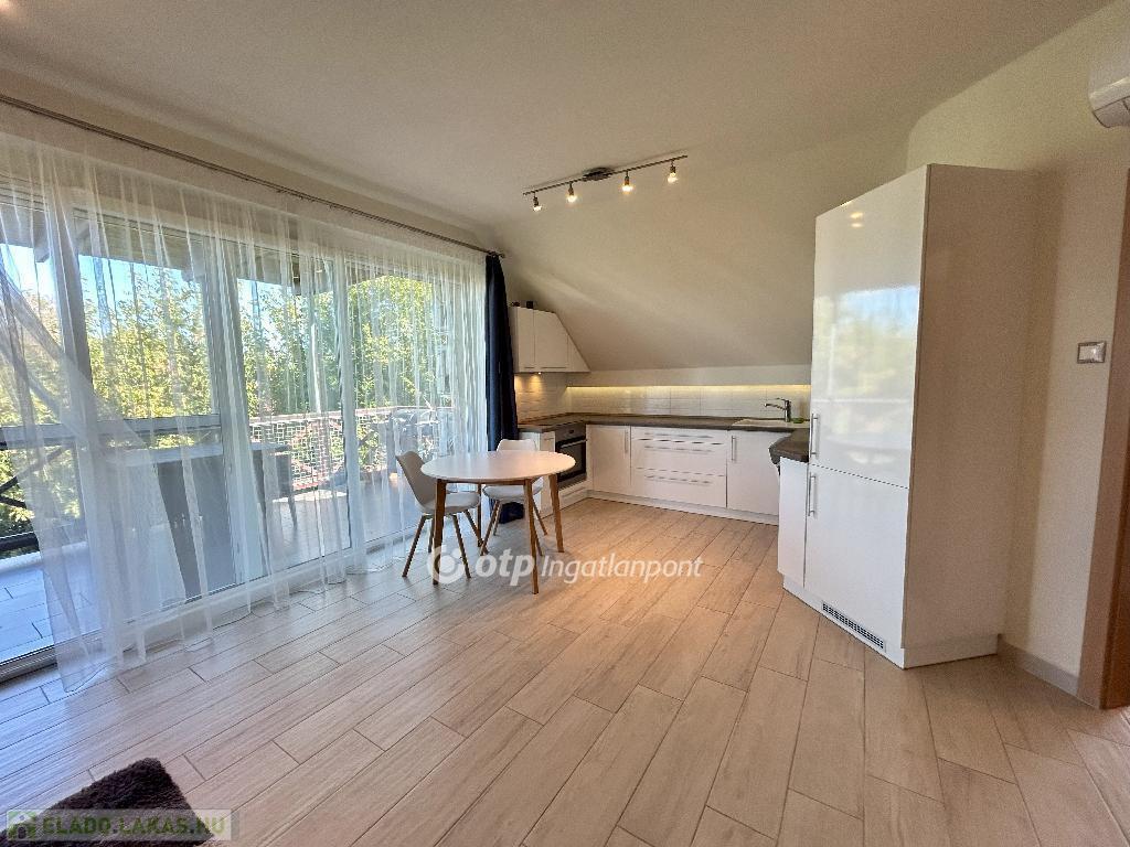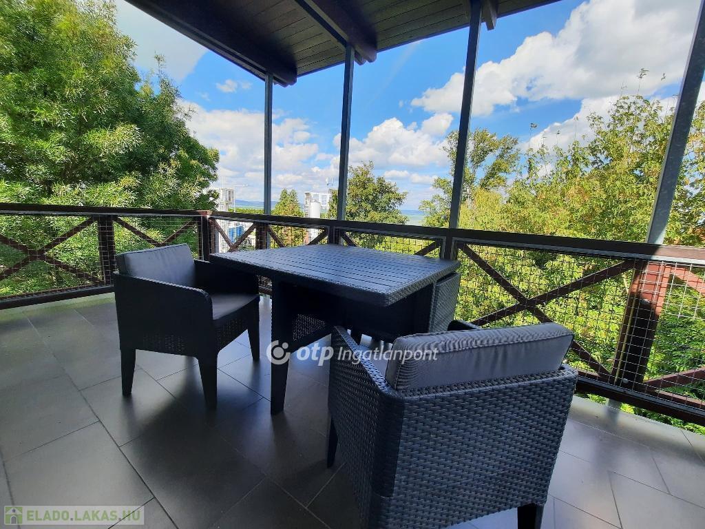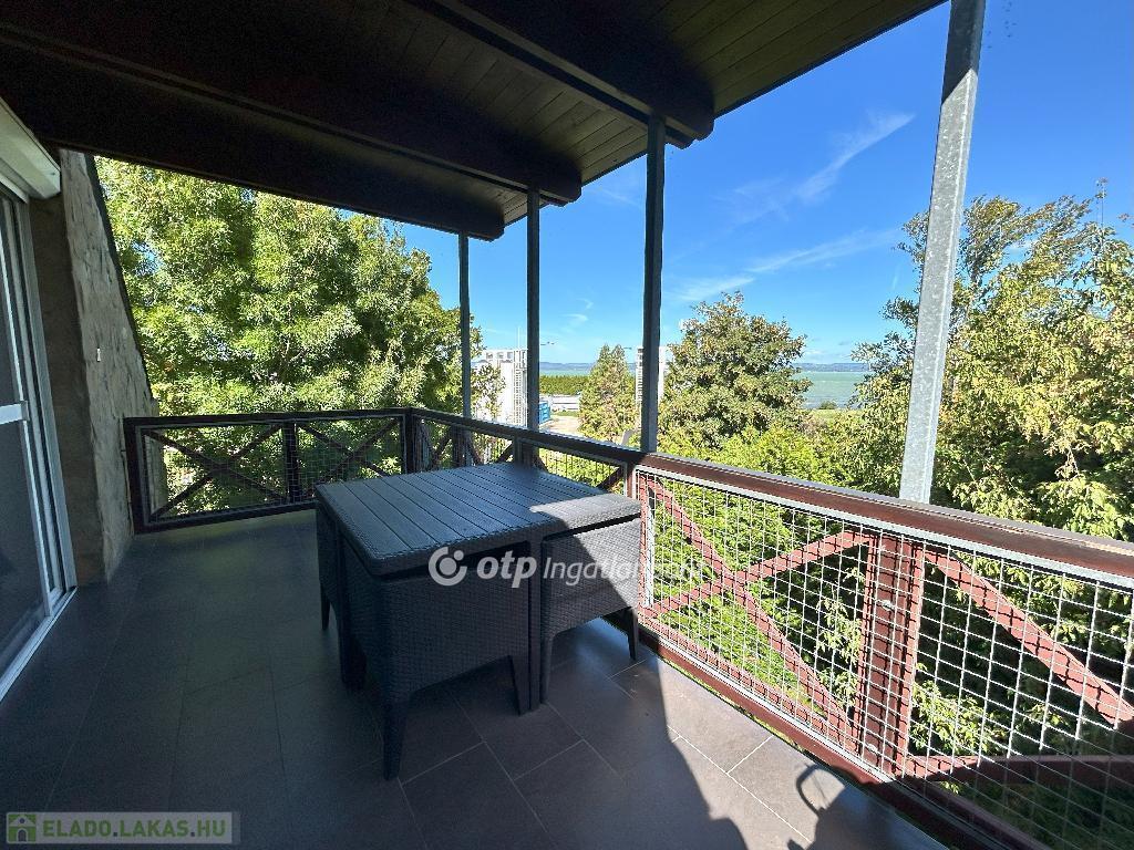 Az ingatlan elrendezése praktikus és élhető: amerikai konyhás nappali, két hálószoba, fürdőszoba és előszoba található benne, valamint egy terasz, ahonnan kilátás nyílik a Balatonra. A lakás északi fekvésű, világos, kellemes klímájú, egész évben jól használható. A fűtésről egyedi gáz-cirkó rendszer gondoskodik, a szobákban és a nappaliban pedig inverteres hűtő-fűtő klímaberendezés is található. Minden közmű egyedi mérőórával rendelkezik.