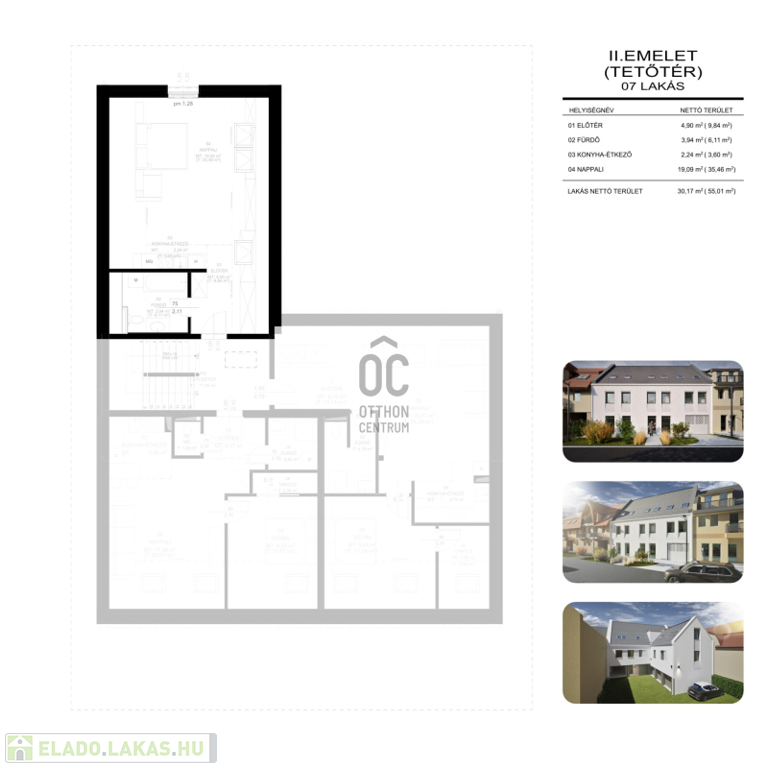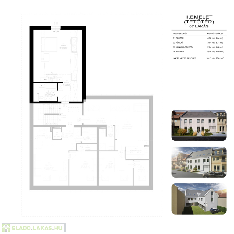 A hirdetésben szereplő 2. emeleti, lakás 30 m2 nettó / bruttó 55 m2-es (tetőtéri)