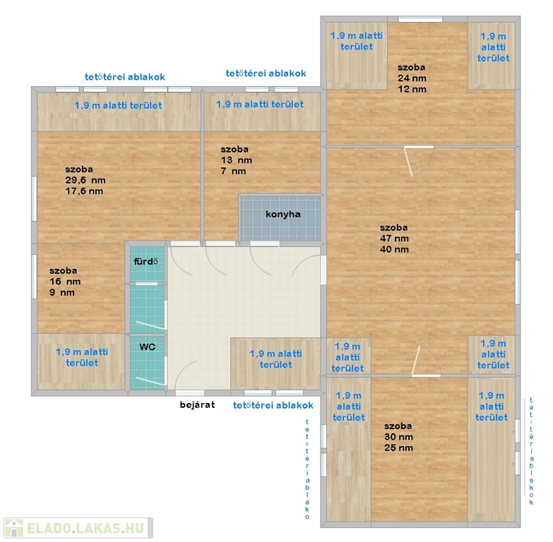 Az ingatlan rendkívül sok lehetőséget rejt magában: egy kisebb átalakítással akár zárt vagy amerikai konyhás nappali is kialakítható, miközben 3-4 hálószoba továbbra is kényelmesen elfér benne.