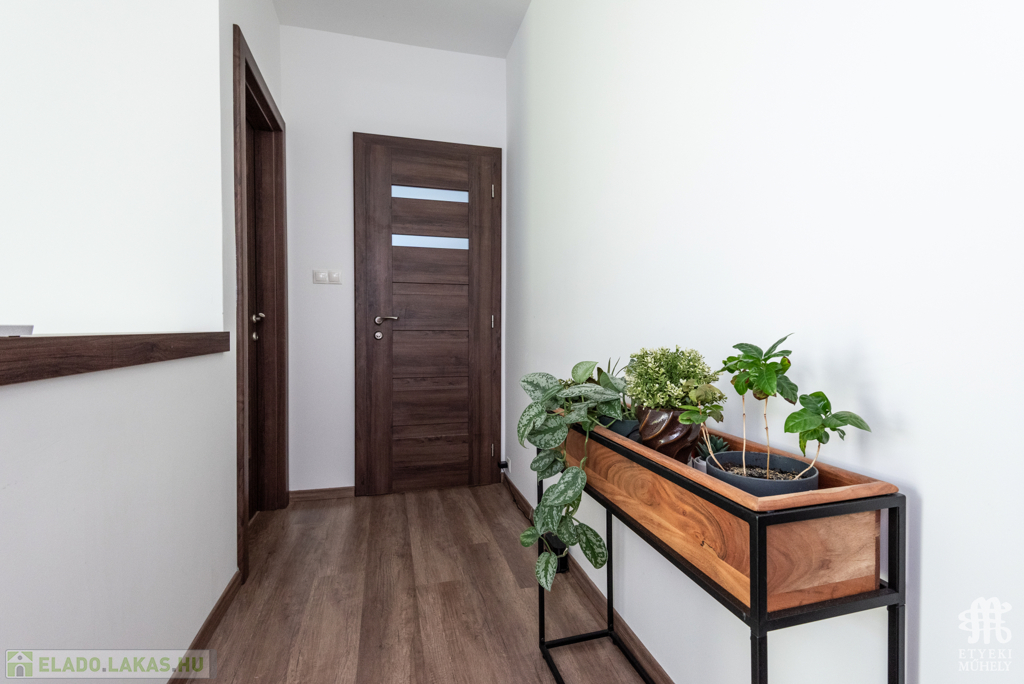 Tájolása tökéletes, reggeltől délutánig beragyog a nap. Az 51 m2-es nappaliba a hatalmas teraszajtóknak köszönhetően kora reggeltől délutánig besüt a nap. A nappaliból és a konyhából is közvetlenül kiléphetünk a 34 m2-es teraszra, ahol a család igazi kényelemben együtt élvezheti a jó levegőt, a kertet és madárcsicsergést. A földszinten található egy önálló fürdőszobával (wc, zuhany, kézmosó) rendelkező szoba, tároló, előszoba, wc és egy 51 m2-es amerikai konyhás nappali. A földszinti hálószoba kiválóan alkalmas vendégszobának, szülői hálónak, idős szülő számára, vagy akár irodának. A kert gondozásához nagy segítséget nyújt az automata öntözőrendszer, és a vízgyűjtő, ami a lehullott csapadékot tárolja az öntözésig.
