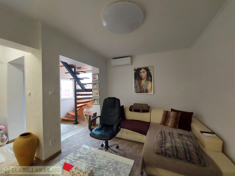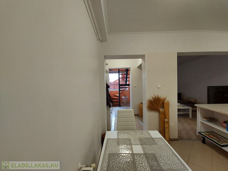 Extrák: tároló, terasz, kerthasználat, panoráma, alacsony fenntartási költség, amerikai konyha, beépített tetőtér, beépített szekrények, boltok a közelben, csendes környék, étkező, iskola a közelben, jó közlekedés, kaputelefon, WC, klíma, központi elhelyezkedés, melléképület, modern szigetelés, nappali, parketta, redőny, riasztó.