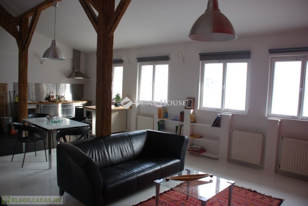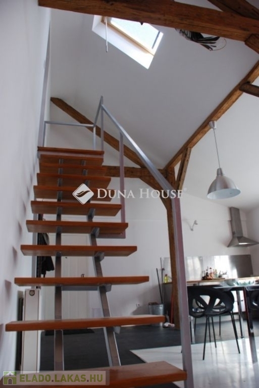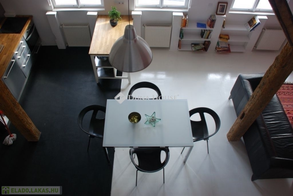 A lakás két szinten összesen 56 négyzetméter: míg az étkezővel és konyhával egybenyitott nappali tágas életteret biztosít, addig a felső szinten található beépített gardróbszekrényekkel és franciaággyal felszerelt hálóhelyiség teljesen privát marad. A belmagasság meghaladja az 5 métert is. A lakás felújítása során megőrizték az eredeti, csaknem 150 éves gerendákat, amik így teljesen egyedi hangulatot kölcsönöznek a tágas szobának. A nappali ablakai a ház belső udvarára néznek, valamint annak is köszönhetően, hogy az ingatlannak nincsenek felső szomszédai, a lakás a tér forgalma ellenére is csendes lakóhely.