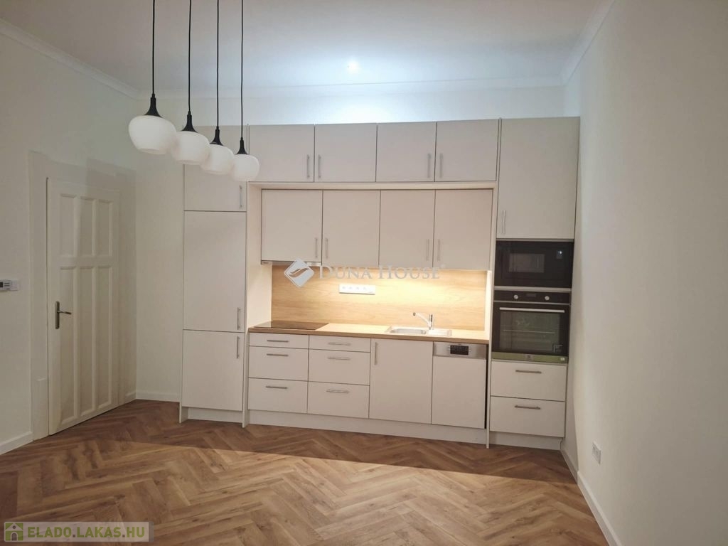 A lakás frissen, az idei évben került felújításra,így az új tulajdonos lesz az első aki élvezheti ennek előnyeit. A lakásban mind a víz és a villanyvezetékek cserélve lettek, új parketta került a szobákba és a nappaliba. A fpadlófűtést Viessmann gázkazán biztosítja. A külső nyílászárók szintén cserélve lettek, redőnnyel felszerelve, a belső eredeti fa ajtók pedig felújításra kerültek. A konyhabútor egyedi gyártású, teljesen gépesített, hűtő, mosogatógép, sütő, mikró,fözőlap. Külön helyiségben került felszerelésre a gázkazán és a mosógép kiállás. Mind a riasztó és a légkondicionáló beüzemelése műszakilag előkészítve, igény szerint beszerelhető. A lakás tehermentes, azonnal birtokba vehető.