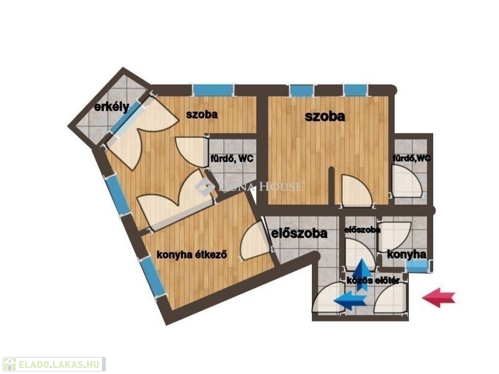 A lakás két apartmanra lett osztva, melynek bejáratai egy közös előszobából nyílnak. A nagyobbik lakrész 47 nm, helységei: előszoba, konyha étkezővel, fürdő WC-vel, zuhannyal, és egy 29 nm -es tágas sarokszoba, erkéllyel. A kisebbik lakrész 39 nm, helységei: előszoba, konyha, fürdő WC-vel, káddal, és egy 26 nm-es tágas szoba.