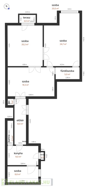 A két nagy szoba a Vérmzőre néz. Egy hall-ból nyílik, ami rugalmasan berendezhető, akár étkezőnek is.
