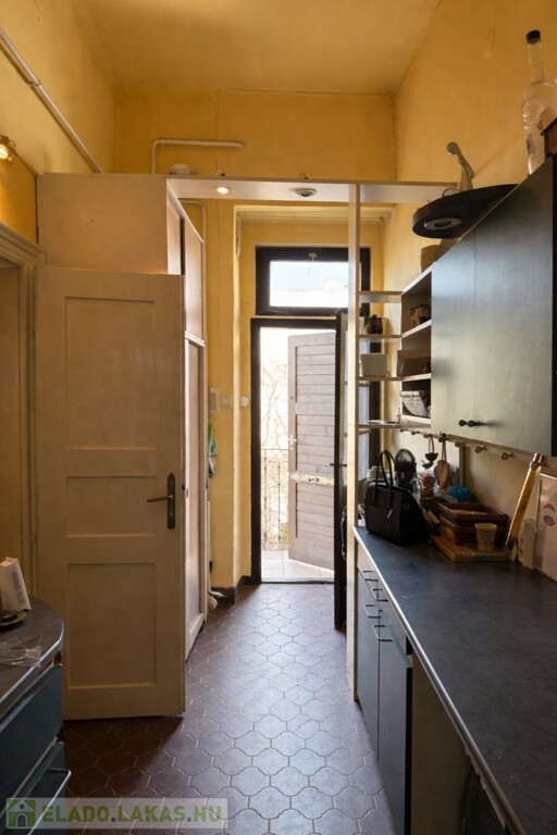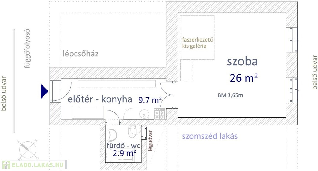 • belső udvari függőfolyosóról nyíló előszoba – konyhatér beépített tároló szekrénnyel beépített konyhabútorral, gáztűzhellyel, melegvíz boilerrel, páraelszívóval,