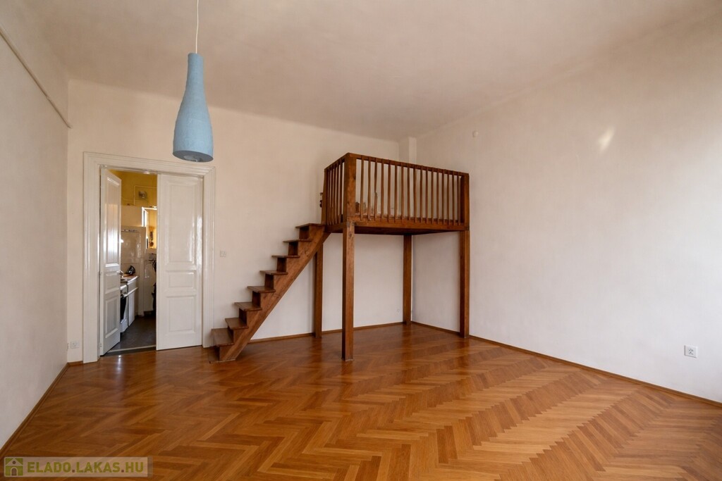 • az előtér – konyhatérből nyíló világos belső zöld udvarra KÖRNYEZETÉRE PANORÁMÁS NAPFÉNYES (délkeleti tájolású) tágas NAGYBELMAGASSÁGÚ (3,65m) SZOBA (kb. 26 nm), jelenleg faszerkezetű kis galériával (2*160m),