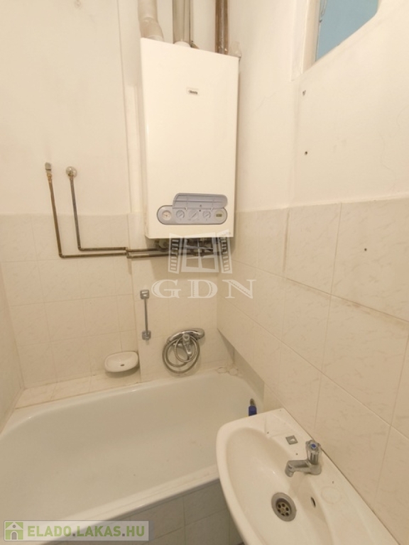 Konyhája az előszobából nyílik, ablakos, belső udvarra néz. A fürdőszoba oldalfala csempézett, káddal szerelt. A WC külön helyiségben kialakított.