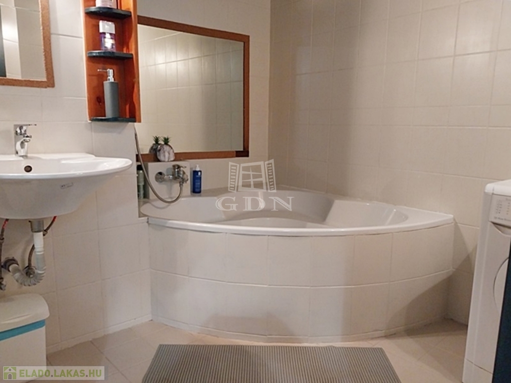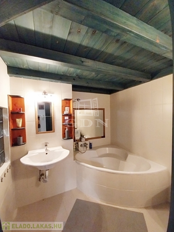 Jobb oldalon találjuk a 3,5 nm-es igazán hangulatos, elegáns ,sarokkádas , egyedi fagerendás megoldású fürdőszobát. Mellette az ablakos külön nyíló mosdót.