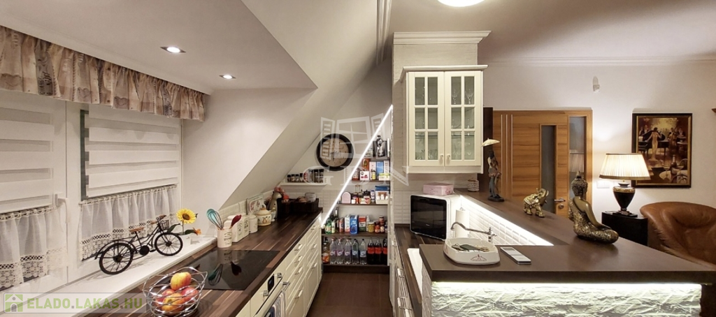 Az 5 lakásos, liftes társasházban található ingatlan világos, jól elosztott, magas minőségben kialakított. A konyha gépesített, a fürdőszobában Grohe és Duravit szaniterek, a nappaliból és hálóból hegyekre néző panoráma.