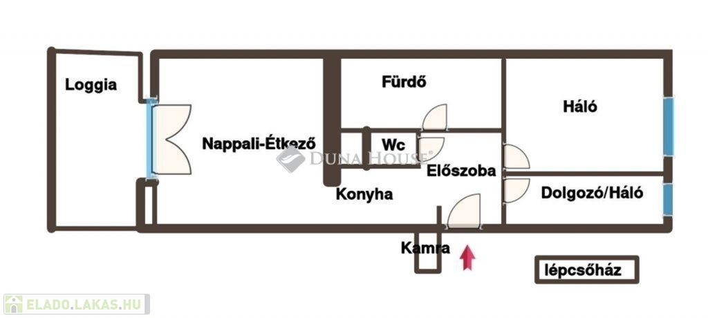 Elosztás: Nappali, konyha + 2 külön nyíló hálószoba (ideális családoknak vagy home office-hoz is).