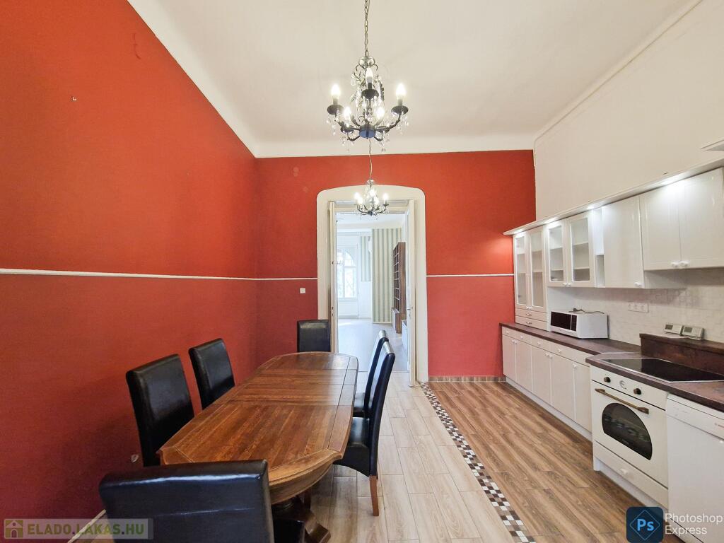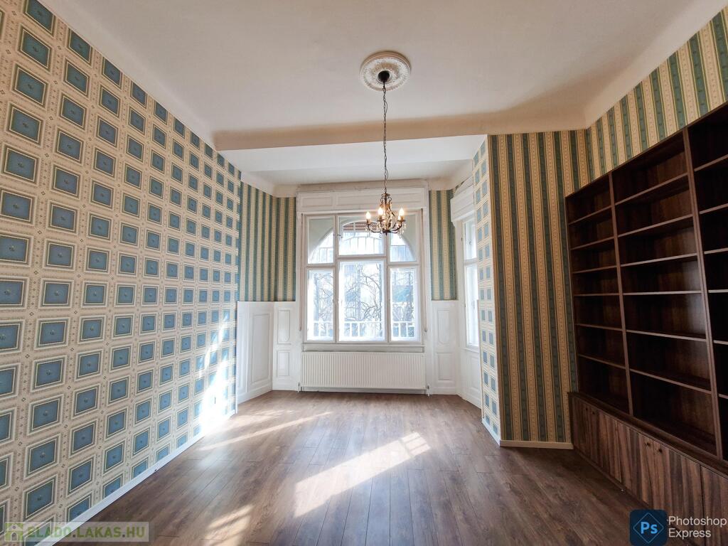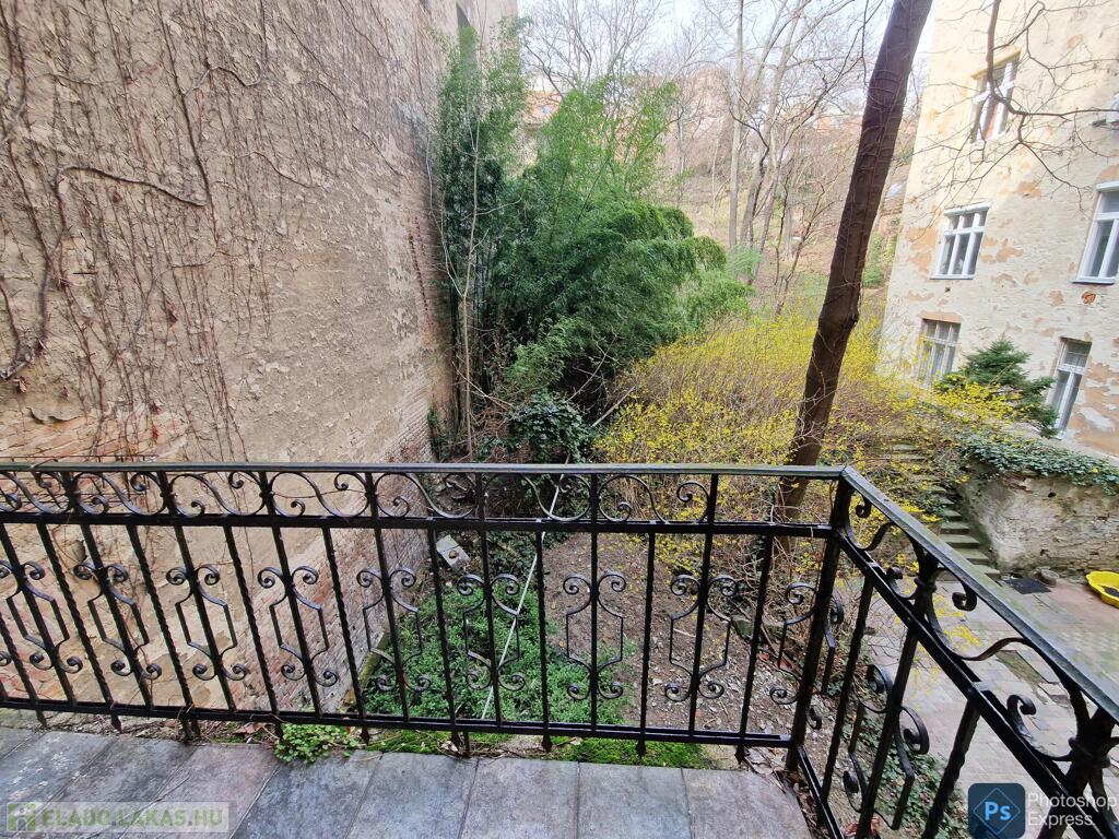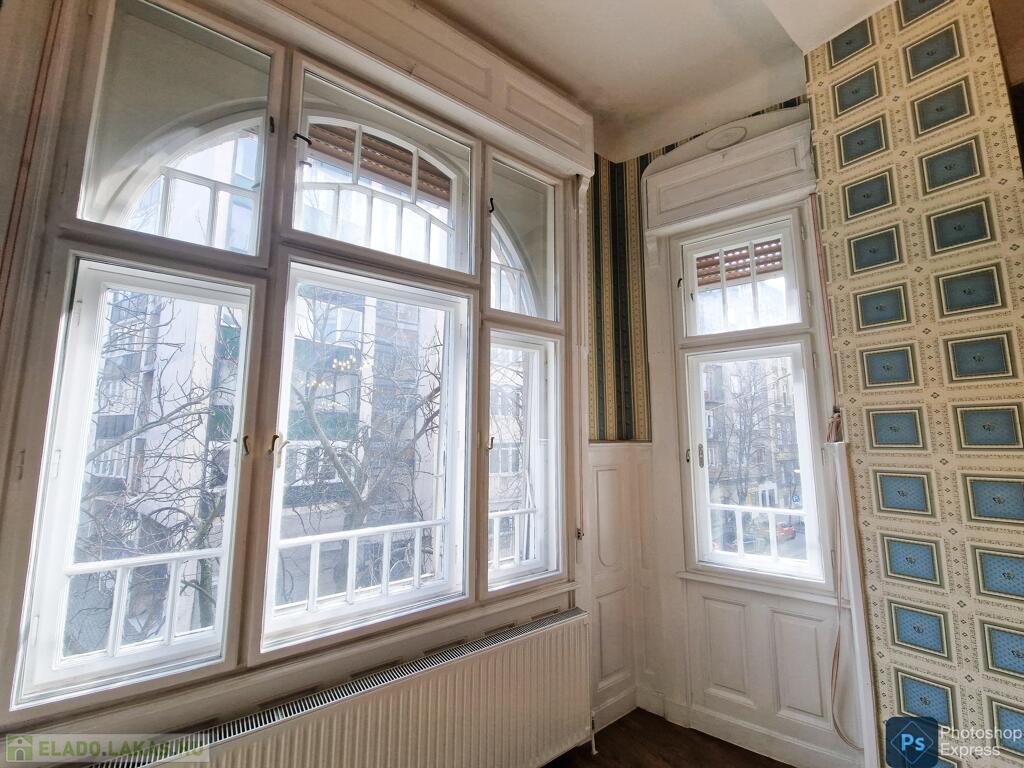 A több,mint 100 éves ház fel van újítva,és csodálatos belső kerttel rendelkezik. Az két lakás egybenyitásával kialakított ingatlan első emeleten található,körfolyosósóról megközelíthető. A kétszárnyú bejárati ajtó tágas előtérbe vezet,és az egész lakást a nagyvonalú ,tágas terek jellemzik.