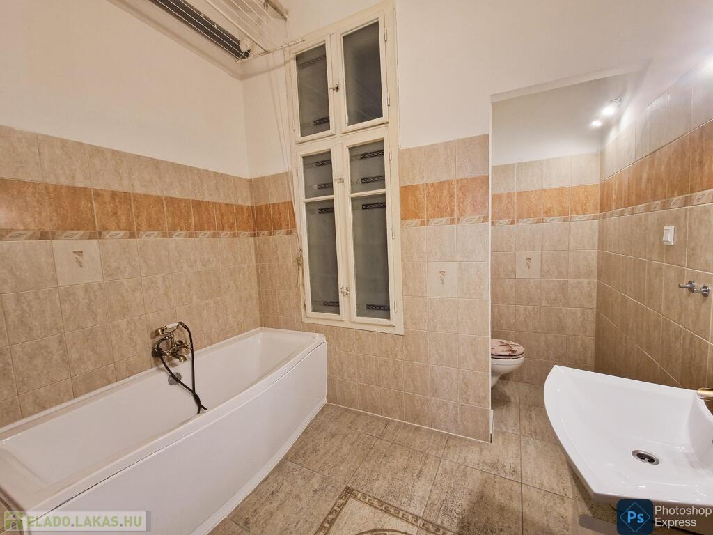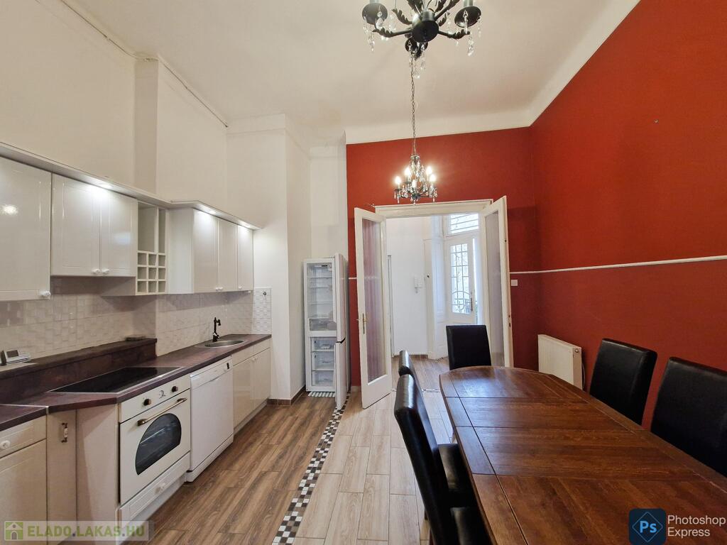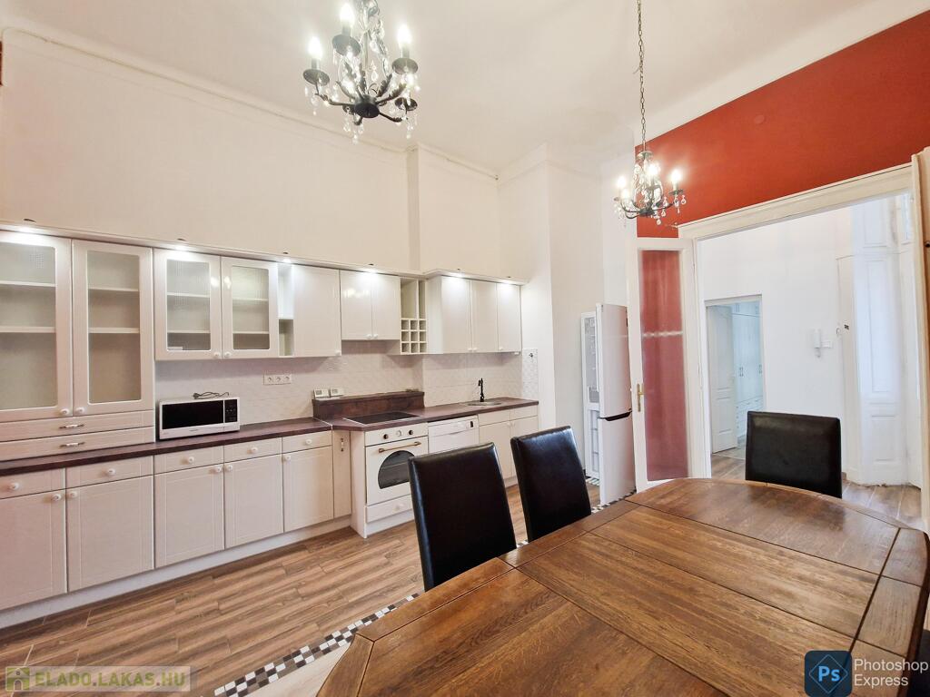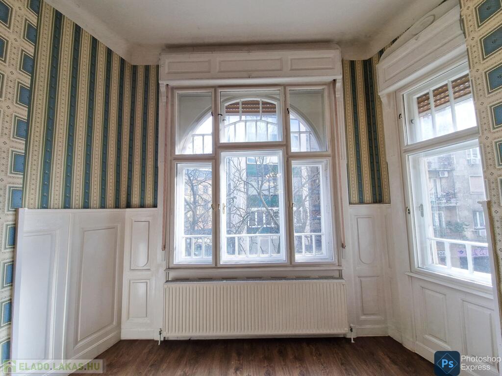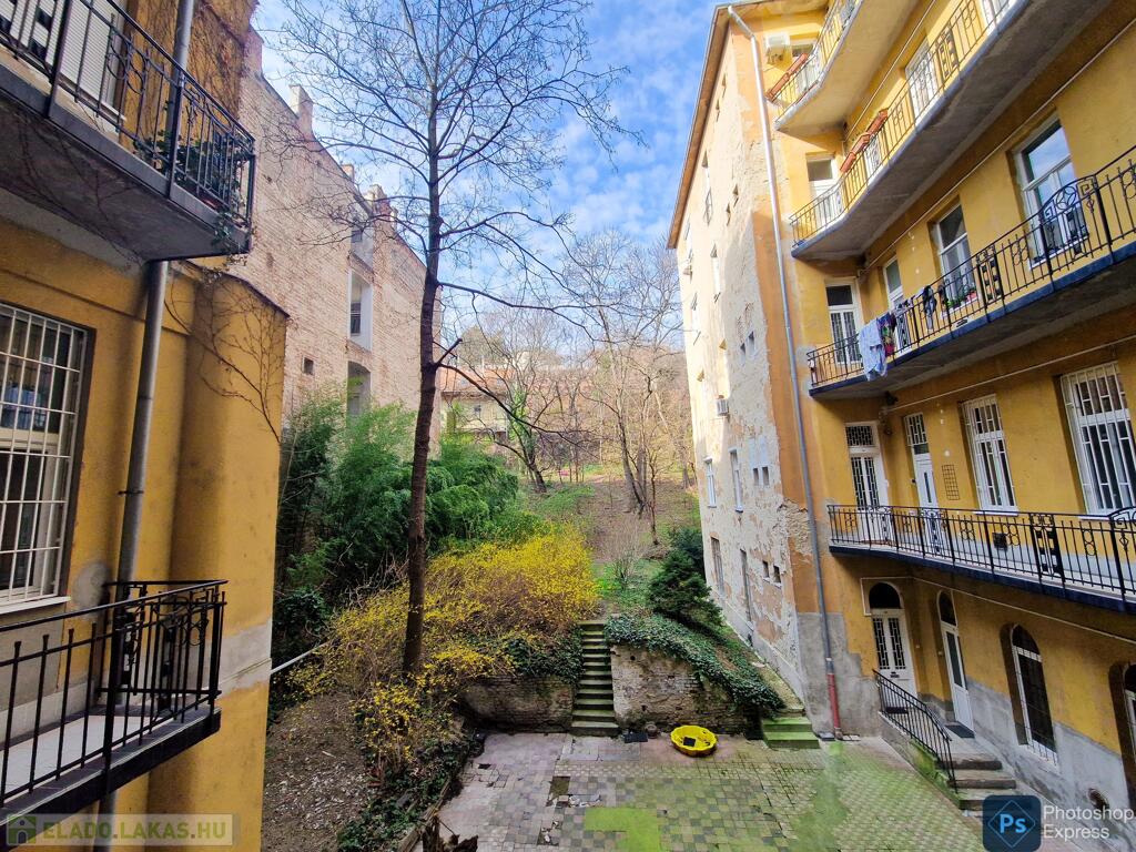 A több,mint 100 éves ház fel van újítva,és csodálatos belső kerttel rendelkezik. Az két lakás egybenyitásával kialakított ingatlan első emeleten található,körfolyosósóról megközelíthető. A kétszárnyú bejárati ajtó tágas előtérbe vezet,és az egész lakást a nagyvonalú ,tágas terek jellemzik.