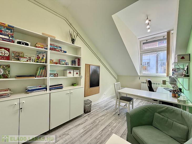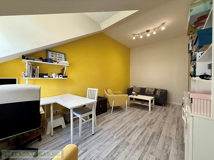 A ház legfelső szintjén található lakás különleges hangulatát az ablakoknál megjelenő enyhe tetőtéri lejtés adja, ugyanakkor a belső terekben sehol nincs lejtés, így a lakótér teljes értékű és jól kihasználható.