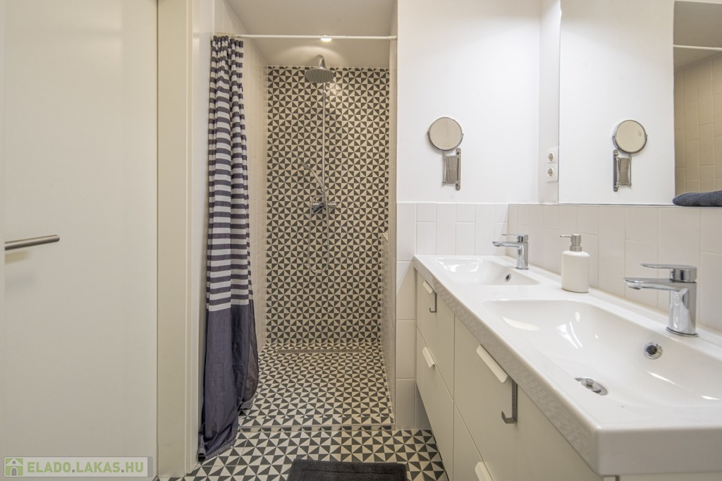 A fürdőszoba zuhanyzós, duplacsappal szerelt, valamint a külön WC mellett itt is található WC.
