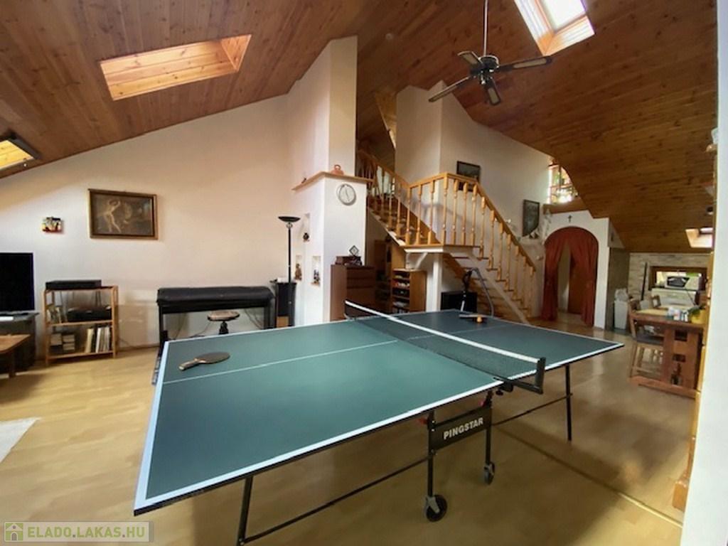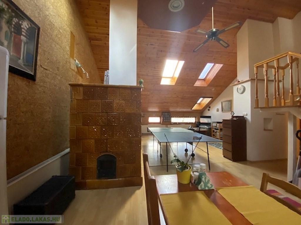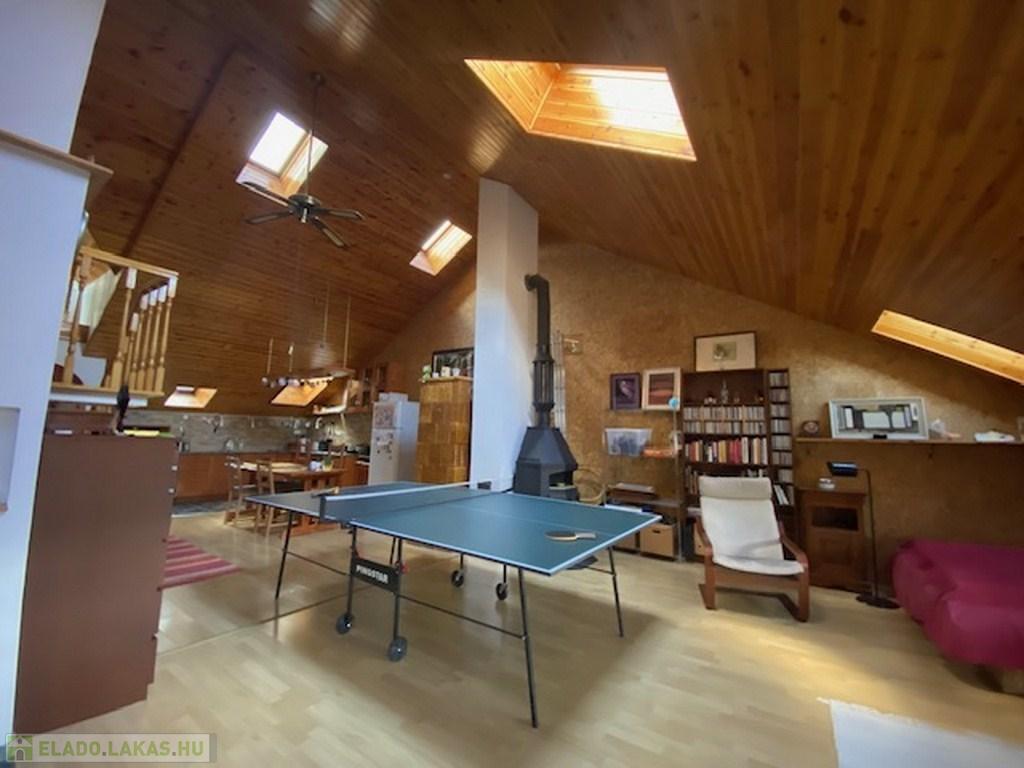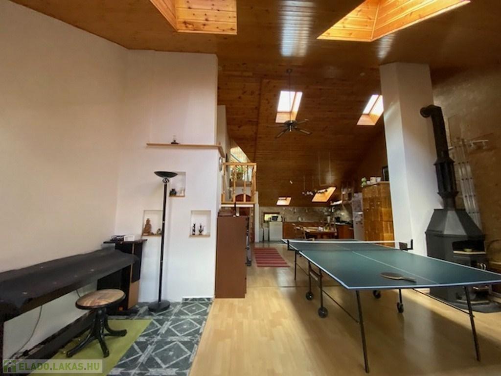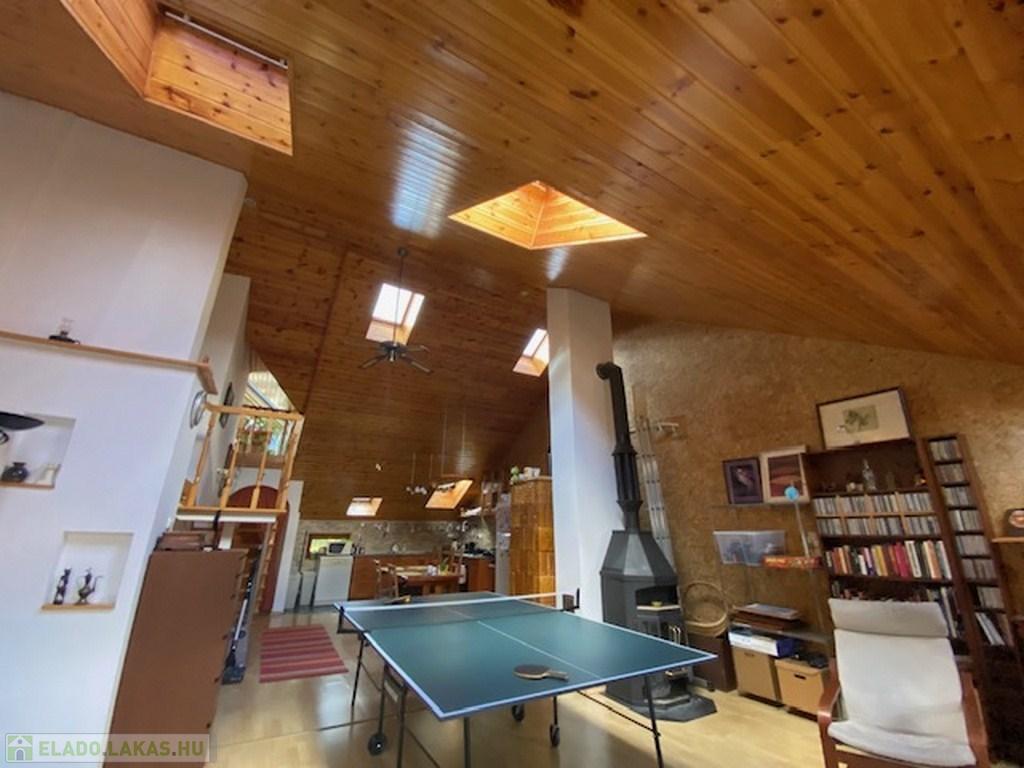 Az előszobából a másik irányba haladva érünk be az ingatlan fő attrakciójához, egy kb 50 nm-es, 4,5 belmagasságú ( legmagasabb pontja) nappaliba. Itt találhatjuk a világos, tágas amerikai konyhát, étkezővel. A nappali további részén jelenleg többek közt pingpong asztal is helyet kapott. Az otthonos, meleg hangulatról a mennyezeti , dupla szigetelésű falambéria, a cserépkályha és egy kandalló gondoskodik.