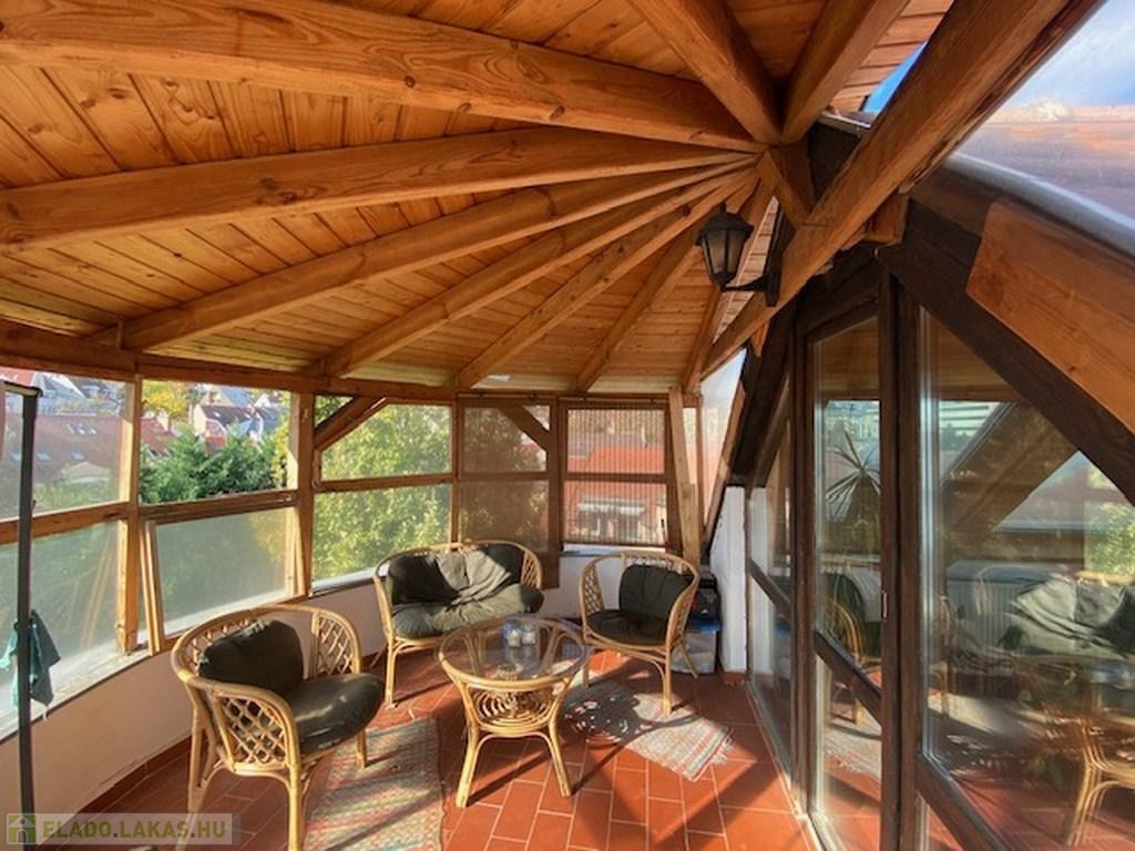 A nagy ablakos közlekedő végén találjuk a beüvegezett, hangulatos teraszt, ahonnan páratlan panoráma tárul elénk, mely délnyugati fekvésének köszönhetően egész nap világos.