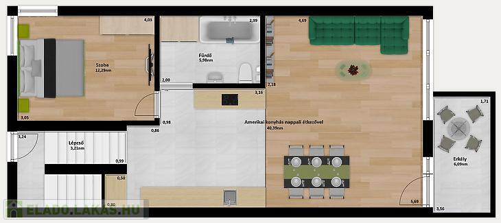 A felső szinten egy amerikai konyhás nappali, hatalmas faltól-falig érő ablakokkal, egy hálószoba és egy fürdőszoba került kialakításra. A nappaliból nyílik a 6nm-es erkély, mely üvegkorlátot kapott. Minden bútor, beleértve a gépesített konyhabútort is, egyedi tervek alapján készültek, kifejezetten ide.