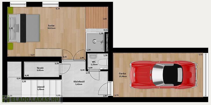Az alsó szinten egy egyedi szoba kapott helyet. Egyediségét a beépített zuhanykabin és az infraszauna adja. Ezenkívül egy külön wc, egy tároló és a garázs. A garázs parkettázott és szekcionált motoros kapuval ellátott, melynek vételára +15M Ft, kötelezően megvásárolandó.