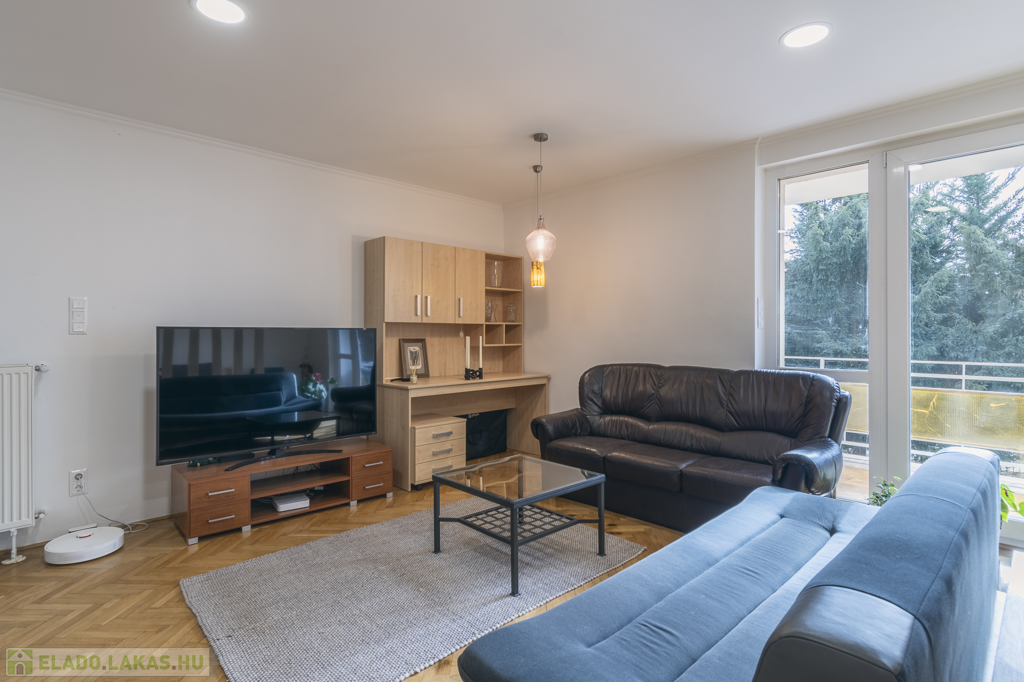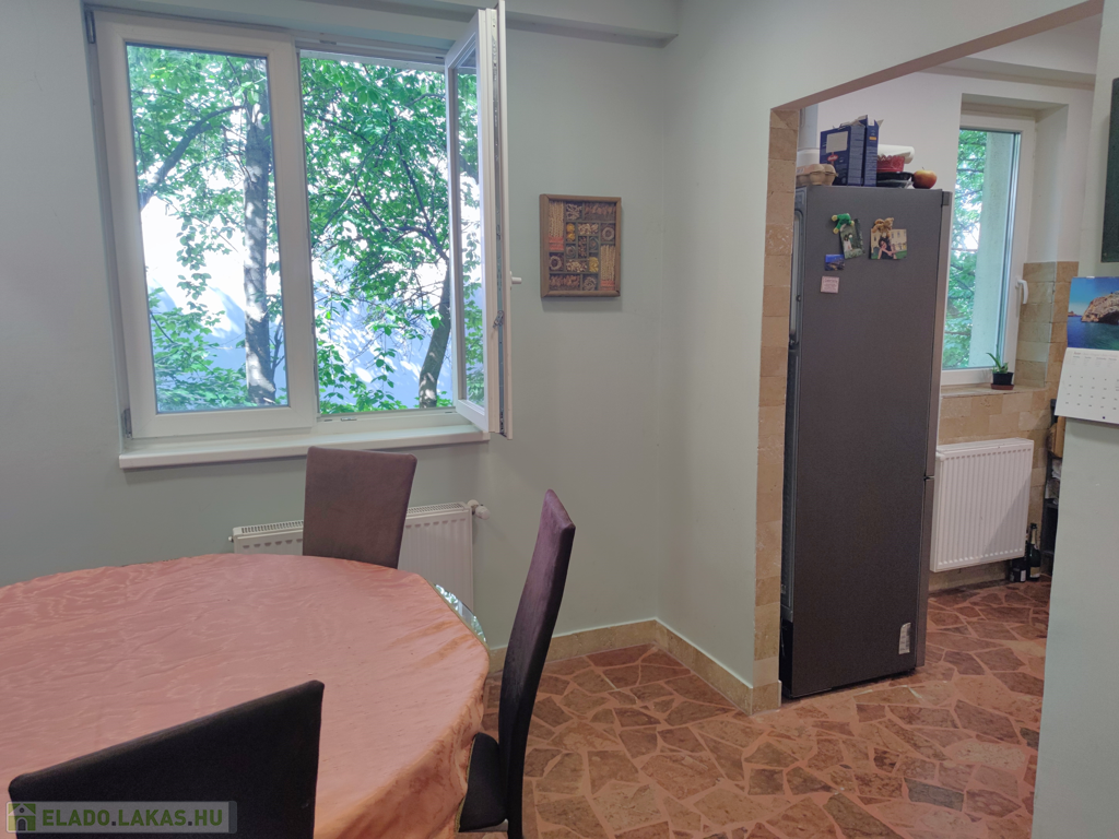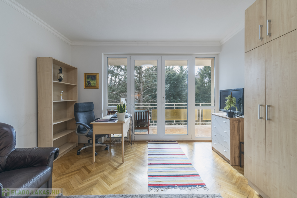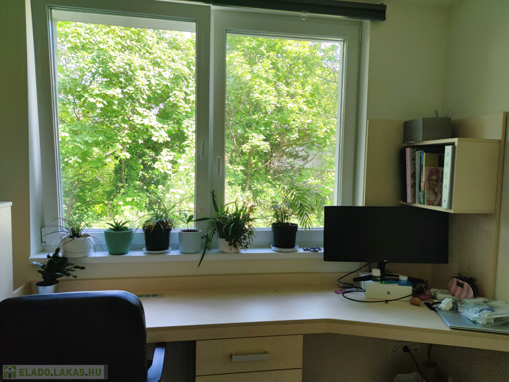 A lakás délnyugati fekvésű, 23 nm-es napfényes teraszáról gyönyörű kilátás nyílik a zöld környezetre. Mindhárom szoba kertre néző, külön bejáratú, a nappali és az egyik hálószoba is a teraszra nyílik.