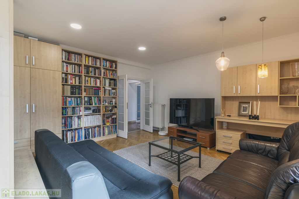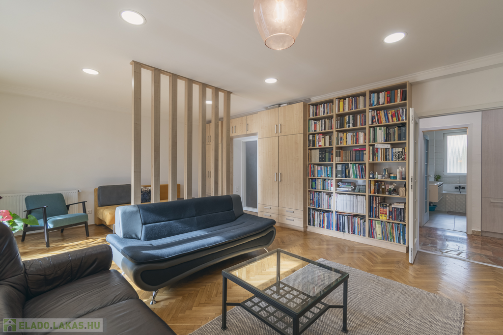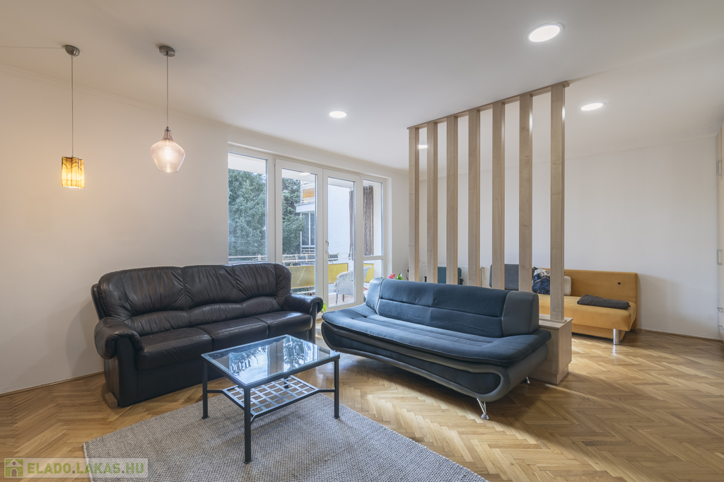 Bp., 2.ker. TÖRÖKVÉSZ ÚTON, Rózsakert Bevásárlóközpont közelében, az utcától távol eső, 120 nm-es, nappali + 2 hálószobás, étkező konyhás, félemeleti, FELÚJÍTOTT, nagy teraszos lakás eladó dupla garázzsal.