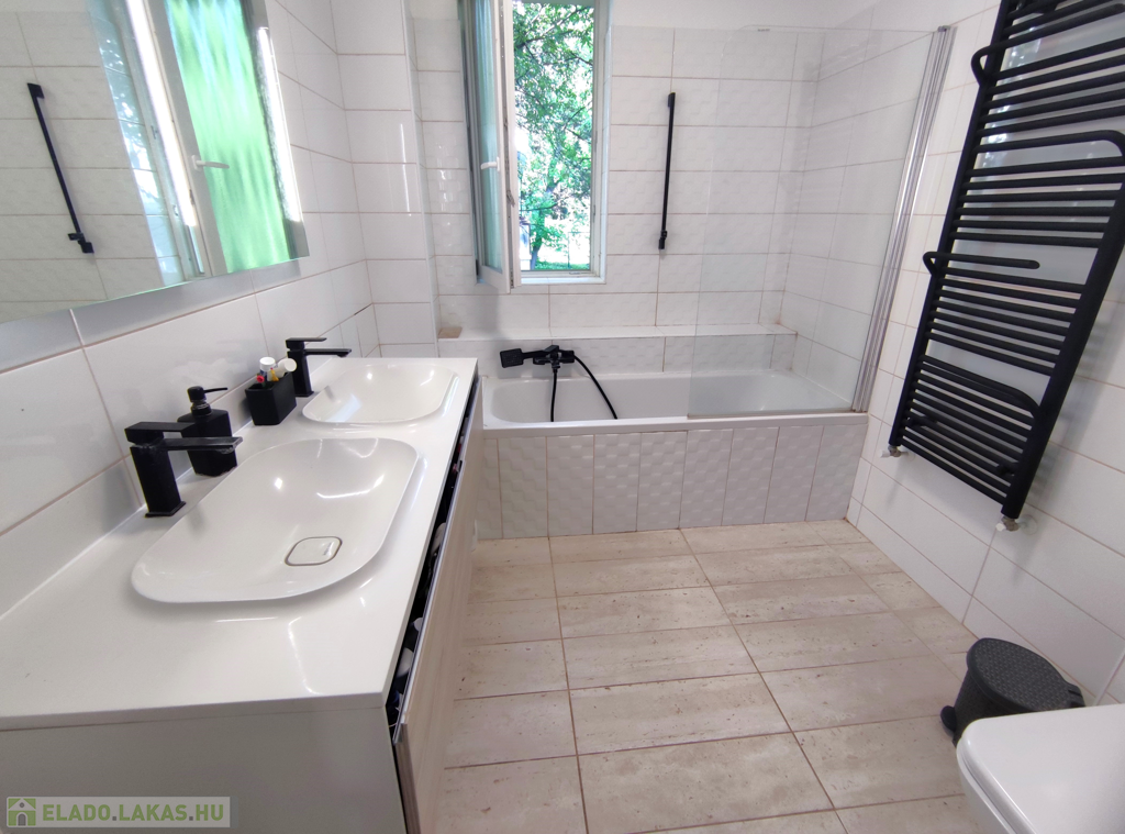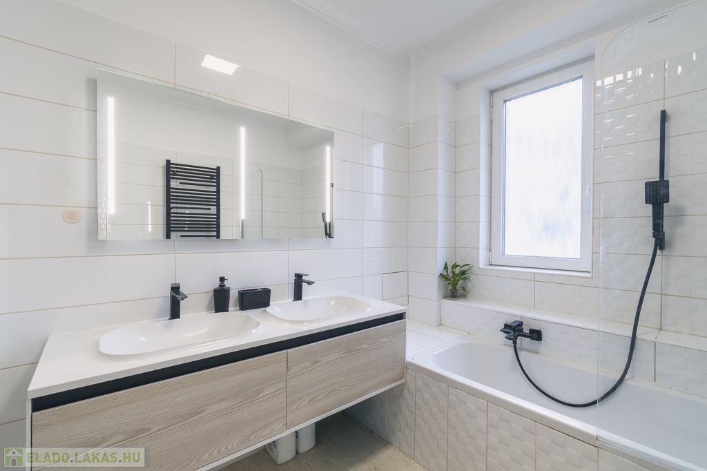 A fürdőszoba ablakos, kád, dupla mosdó, gyönyörű integrált világításos tükör, wc és törülközőszárító található benne. Külön wc is van.