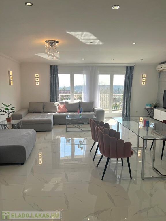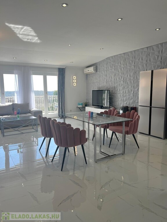 Az amerikai konyhás étkező-nappali hatalmas ablakain árad be a napfény, az erkélyről gyönyörű panorámát élvezhetünk a budai hegyek felé, valamint a medencés kertre. Az ablakok redőnyökkel felszereltek. A lakást 2006-ban teljeskörűen felújították.