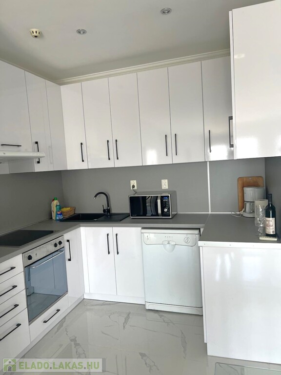 The large windows of the American kitchen-dining room and living room let in sunlight, and from the balcony you can enjoy a beautiful panorama of the Buda hills and the garden with a pool. The windows are equipped with shutters. The apartment was completely renovated in 2006.