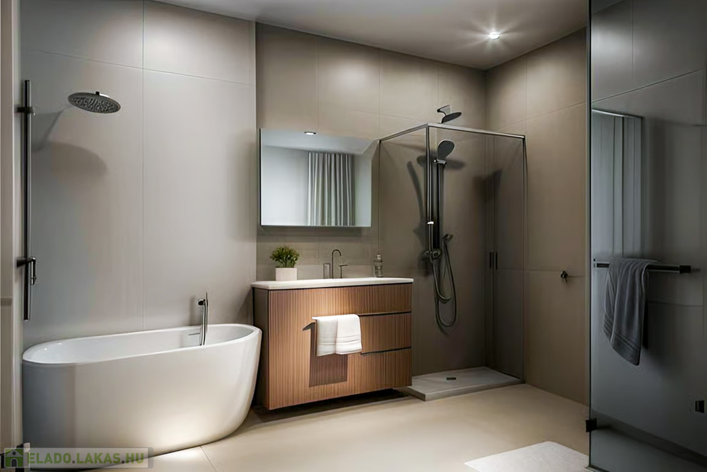 Szaniterek: Kád: H2O Mona, Zuhany tálca: H2O Nero, Mosdó kézmosó, w.c., bidé: Roca Debba. Csaptelepek: Hansgrohe