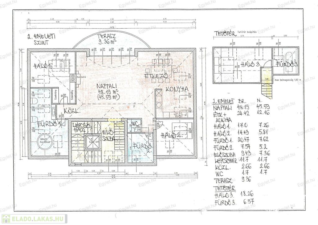 • Belső 2 szint, melyből a felső szint 27 m² -es szoba + fürdőszoba WC-vel