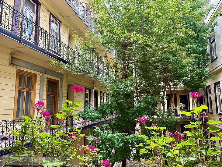 Az ingatlan csendes, zöld és rendezett udvarra néz, ami nyugodt, kellemes környezetet biztosít.