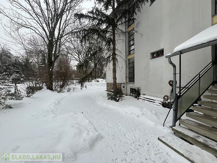 A ház mögött egy nagy, osztatlan közös tulajdonú kert található, amely nyugodt, zöld környezetet teremt a lakók számára – igazi kis oázis a városban.