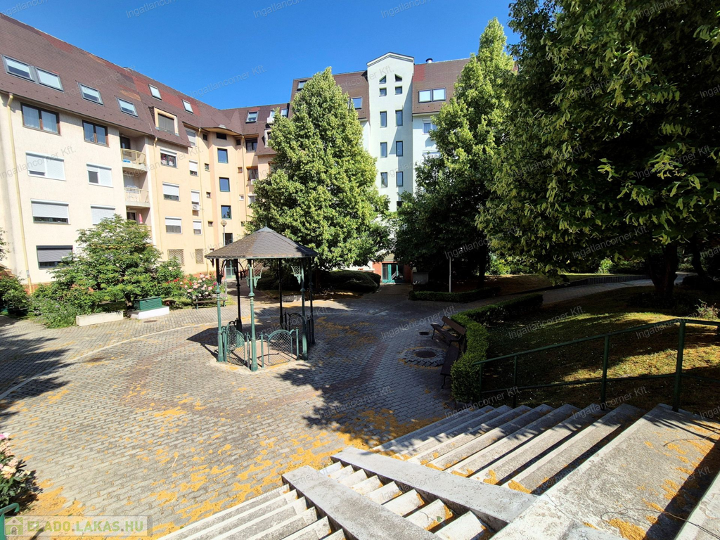 -Maga a társasház 5. tömbből áll, melyet középen egy madárcsicsergős, csendes, gyönyörűen rendben tartott, fákkal –bokrokkal övezett, HATALMAS BELSŐ PARK teszi igazán különlegessé. A parkban állva az ember tökéletesen elfelejti, hogy egy lüktető budai kerület közepén tartózkodik.