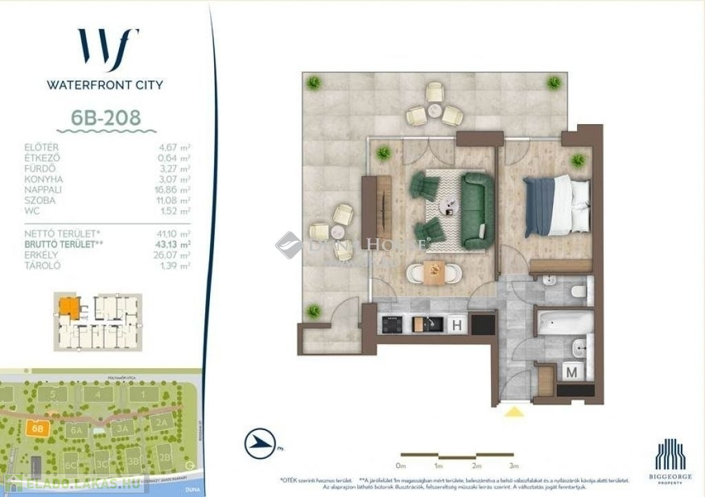 A Waterfront City - 4.ütemében, 2025-ben átadott 6b épület 2. emeletén, 43 m² br alapterületű, különleges a Dunára félpanorámával, zöld kilátással és 26 m²- es hatalmas félkörerkéllyel rendelkező saroklakást kínálunk megvételre.