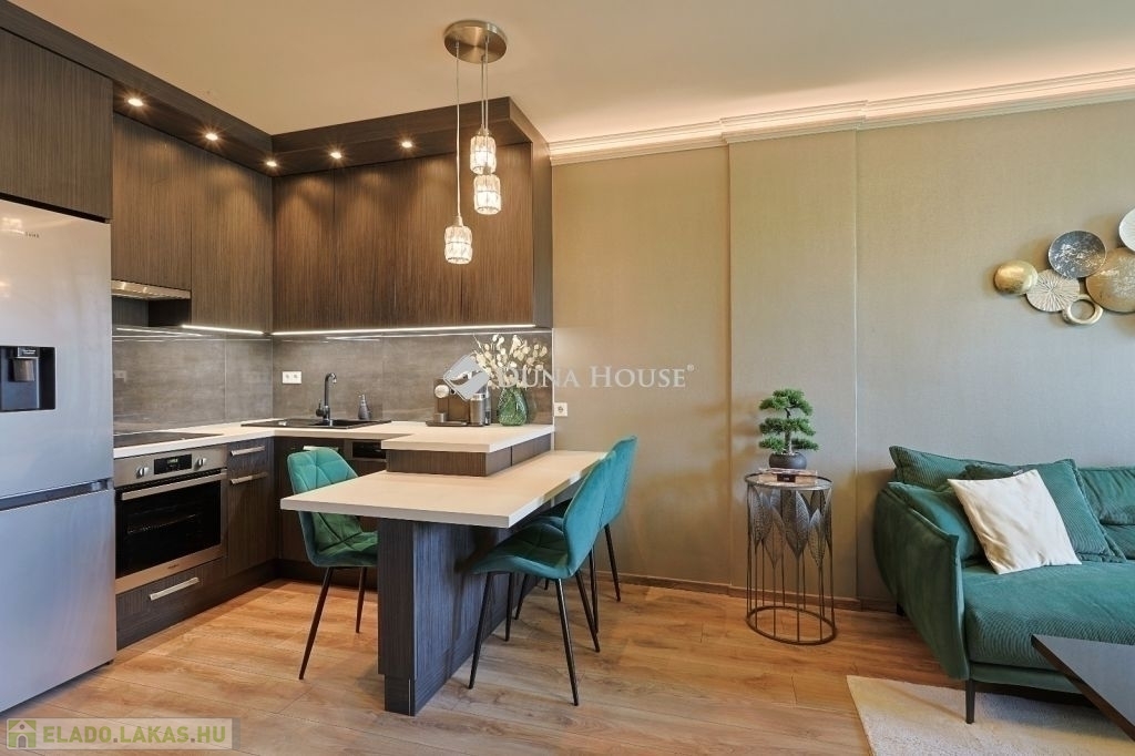 Eladó egy újszerű, teljesen bútorozott, 2 szobás lakás Óbuda zöldövezeti részén, a Testvérhegy lakókert 3. ütemében.