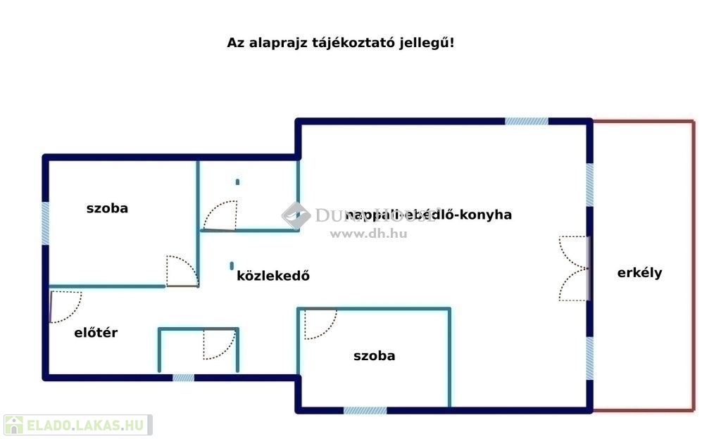 Az ingatlan az alábbi helyiségekből áll: panorámás nappali + konyha, 2 szoba, előszoba, fürdő+wc, lépcsőtér, erkély, háztartási helyiség, tároló.